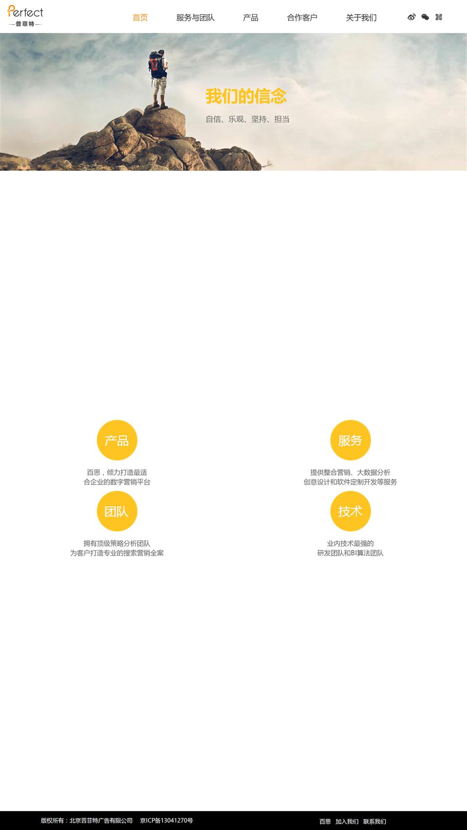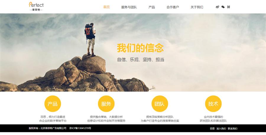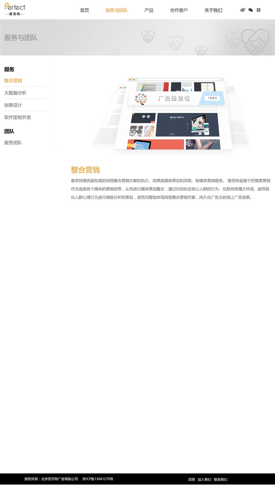 普菲特成立于2008年,公司主要提供營銷策劃、創(chuàng)意設計、技術開發(fā)、廣告代理、網絡營銷、 人才培訓及輸出等服務,公司確立用"技術平臺+人工響應"的服務模式為合作客戶提供全媒體、個性化 的整合營銷服務,幫助客戶建立整合營銷能力和評估體系。
