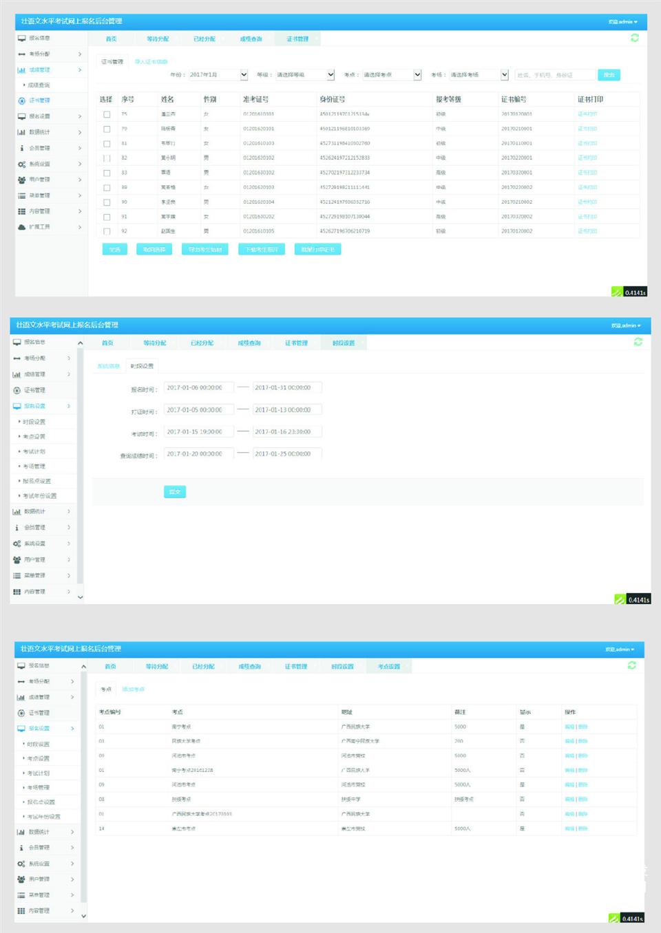 壯語考試系統(tǒng)是廣西壯族自治區(qū)民族宗教事務(wù)委員會(huì)建設(shè)網(wǎng)上考試壯語的報(bào)名系統(tǒng),功能有網(wǎng)上考試報(bào)名、報(bào)名審核、考場分配、考試成績單查詢、證書打印及考生數(shù)據(jù)分析系統(tǒng)等。實(shí)現(xiàn)在線考試報(bào)名與成績查詢,具備考生網(wǎng)上報(bào)名、自動(dòng)生成準(zhǔn)考證號、考場號、座位號、座位帖、每個(gè)考場座位匯總表、考生信息匯總表(后臺),打印考生報(bào)名表、準(zhǔn)考證號(前后臺)、成績單、考試證書(后臺),在線成績查詢,提交印刷廠印刷證書當(dāng)年考試合格考生名單及照片、后臺考生相關(guān)數(shù)據(jù)統(tǒng)計(jì)分析等功能。